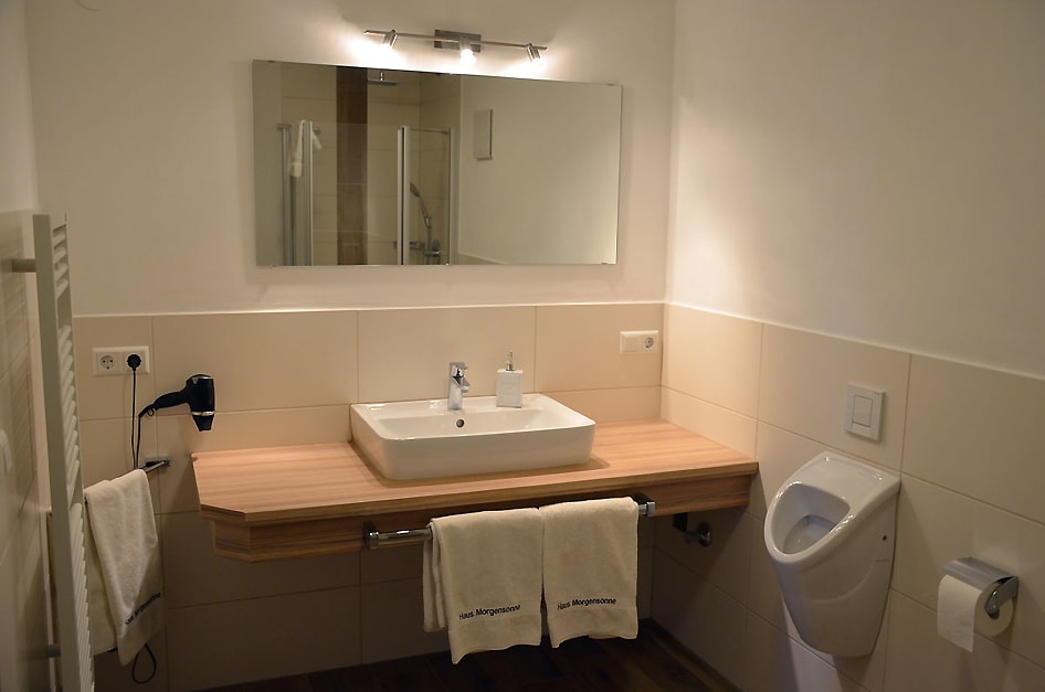 - Geräumiges Badezimmer mit Waschbecken, großem Spiegel, einer ebenerdigen Dusche, einem WC sowie Pissoir